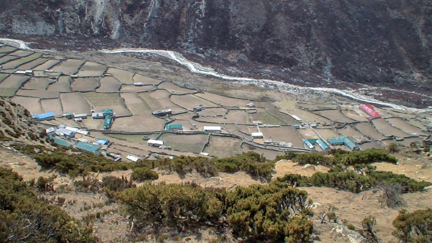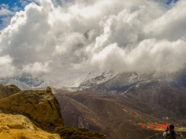 Tepeye çıkış oldukça dikti, yavaş yavaş 3-4 saat tırmandığımız yolu yaklaşık bir saatte indik. Bulutlar dağları izlememize pek fırsat vermedi ama vadinin hemen karşısında olan Ama Dablam bulutların arasından sık sık kendini gösterdi. Thengboche’den itibaren son üç gündür bize eşlik eden Ama Dablam’ı bu yükseklikte karşıdan izlemek nefes kesiciydi. Öğleden sonrasını dinlenerek geçirdik. Rehberliğimizi yapan Sherpa’ların uyarısıyla çıktığımız tepede görülmesi çok ender olan kar leoparının ayak izlerini gördük, maalesef kendisini görecek kadar şanslı değildik. Buluttan perdelerin açıldığı kısacık anlarda ihtişamlı dağların manzarasına bir de uçan bir kuş sürüsü eşlik ediyordu.