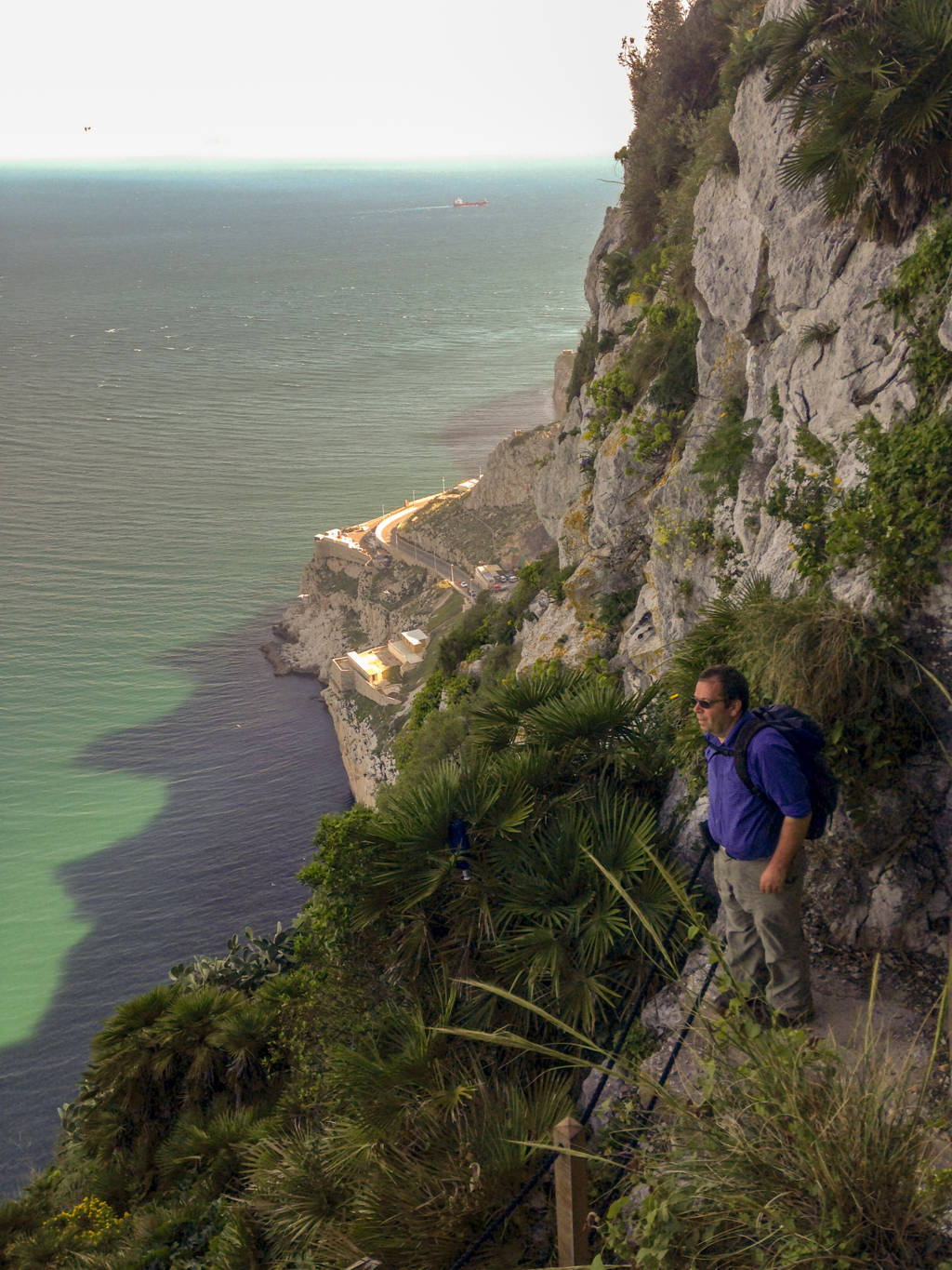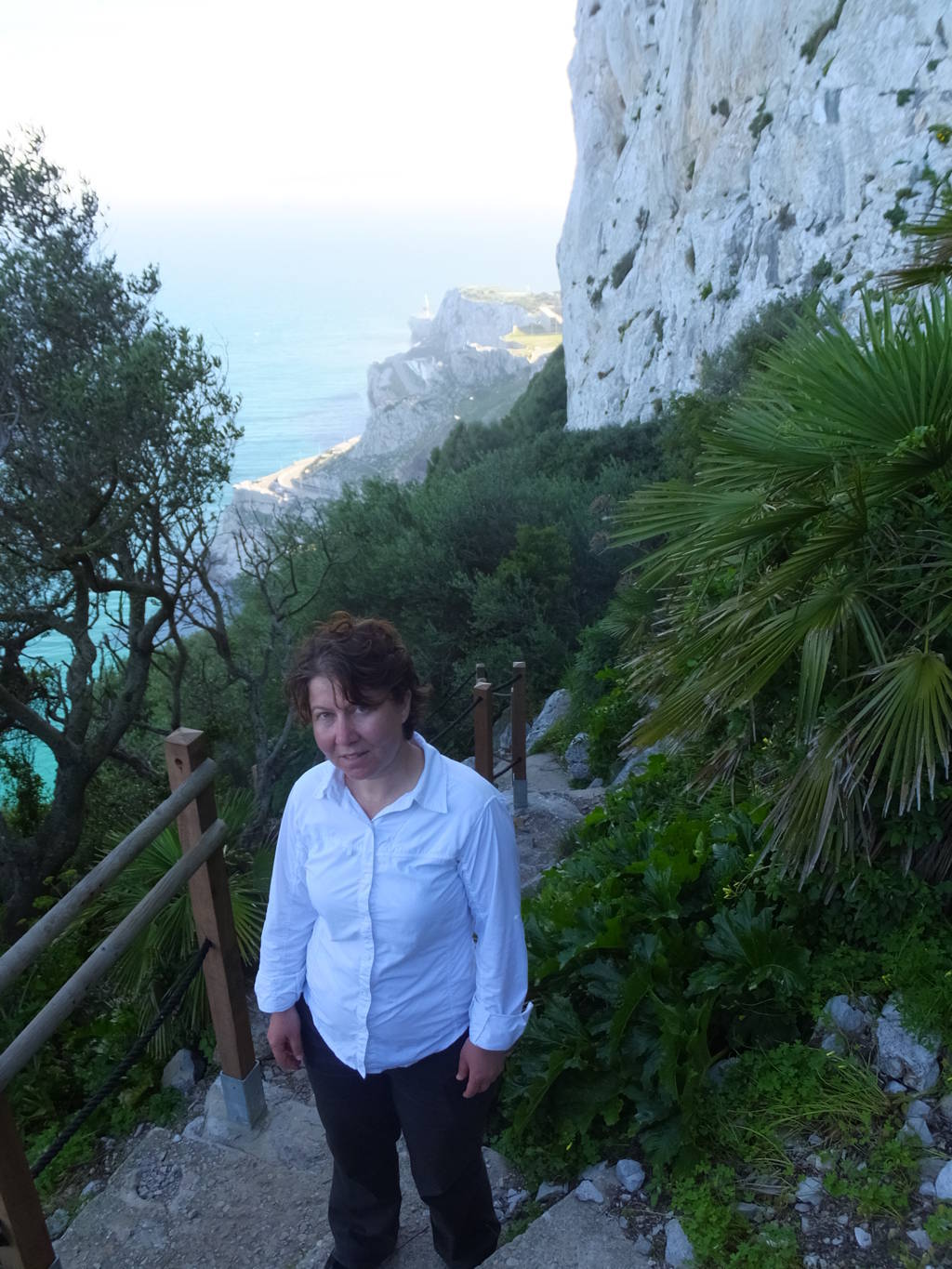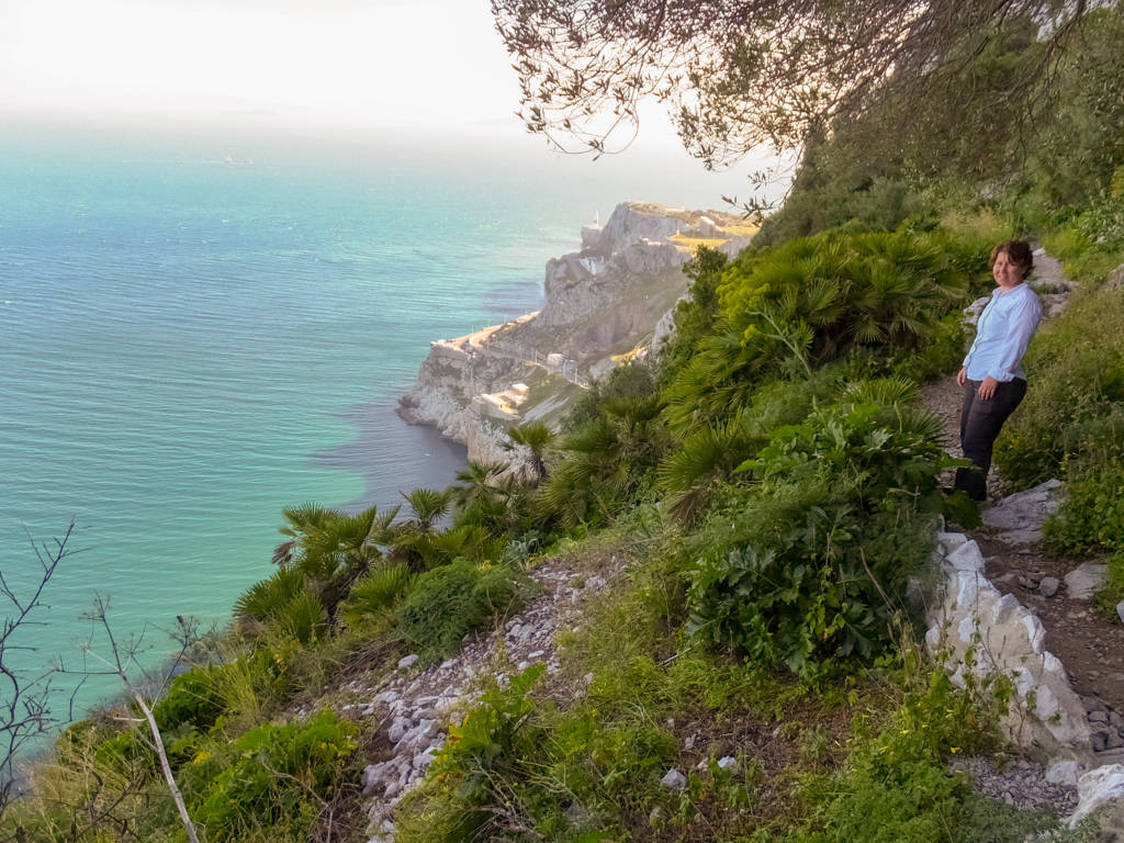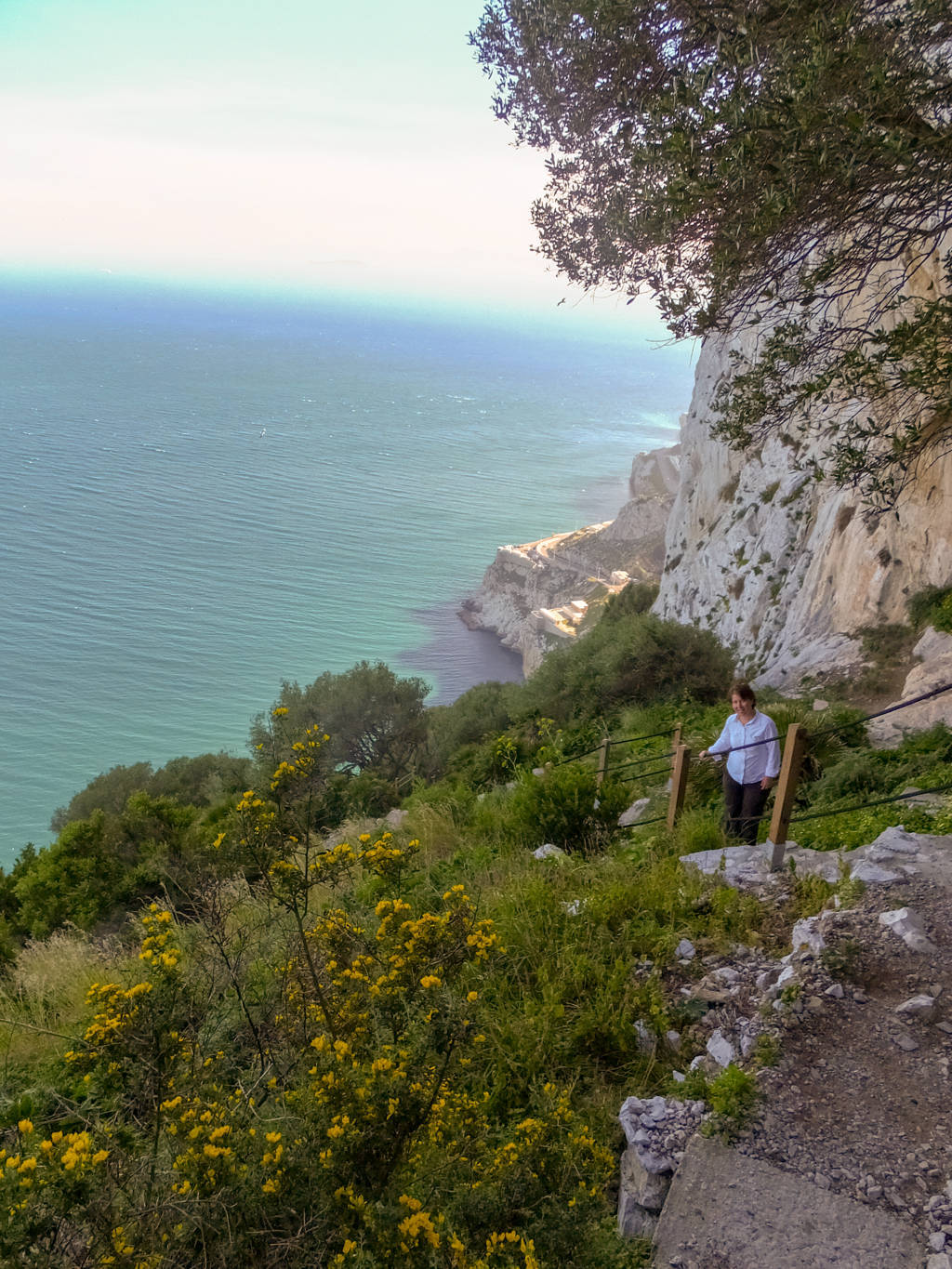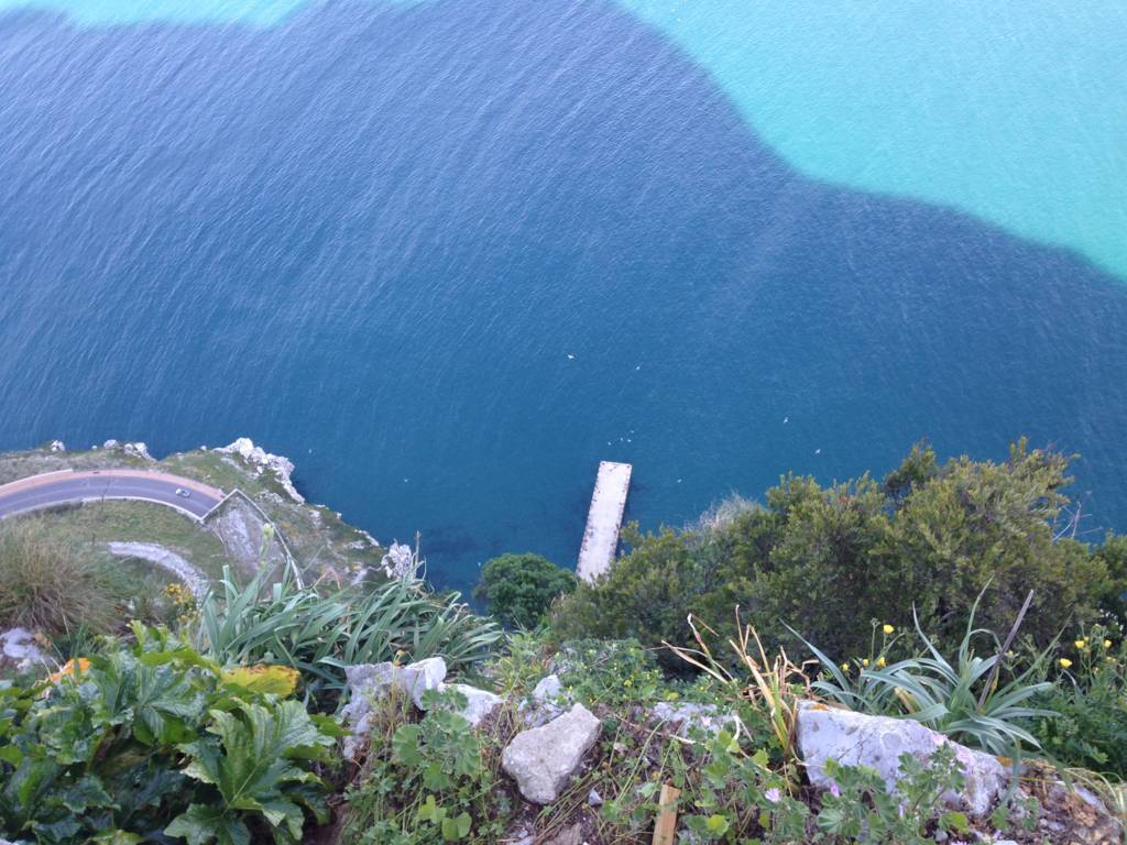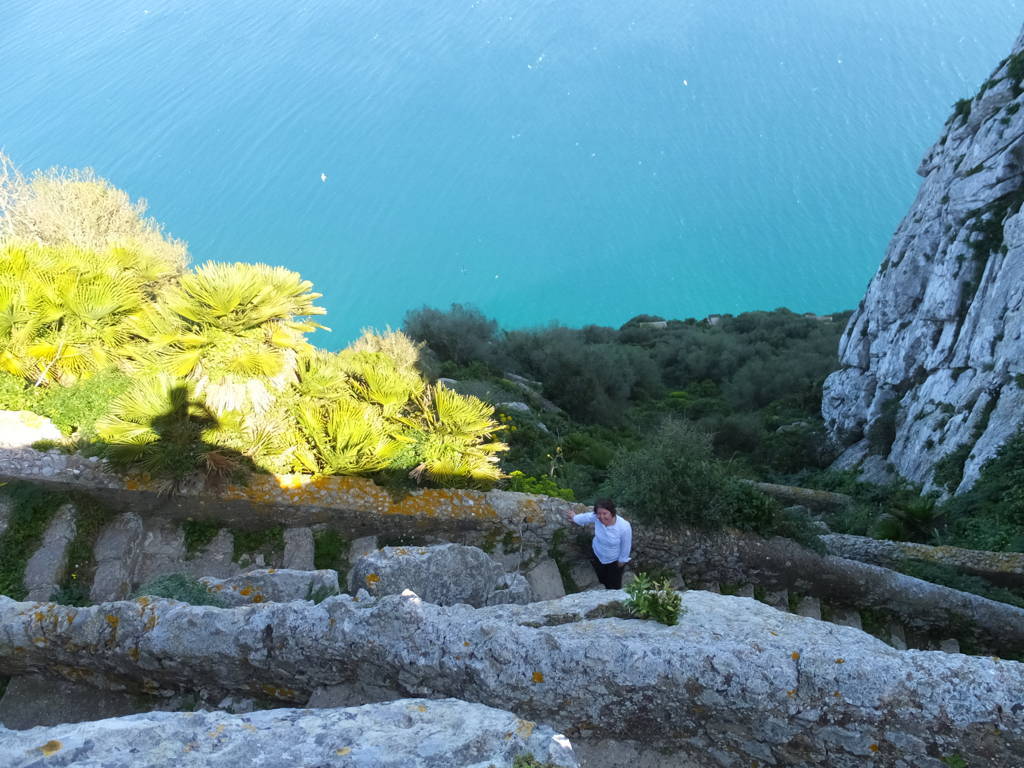 Bu arada arkadaşlarımızdan ayrılarak yola devam ettik, sırt boyunca yürüdük, en tepedeki O’Hara’s Battery noktasından, kayanın doğu cephesinden aşağı doğru inen dar merdivenleri gördük ve “Akdeniz merdivenleri” denilen ve denize doğru inen dik yamacındaki bu dar patika ve merdivenlerden, muhteşem manzaralar eşliğinde hiç tereddüt etmeden aşağı doğru yürüdük. Boş zannettiğimiz ve nereye ulaşacağını bilmediğimiz çok dik olan bu patikadan, spor amaçlı koşarak çıkan yerlileri görünce yürümeye devam ettik. Uçurumların kıyısından, bazen kayalar oyularak yapılmış tünellerden geçerek yola devam ettik. Kendimizi manzaraya ve ortama öyle kaptırmışız ki yol bizi nereye götürürse götürsün devam etmemek imkânsızdı zaten.